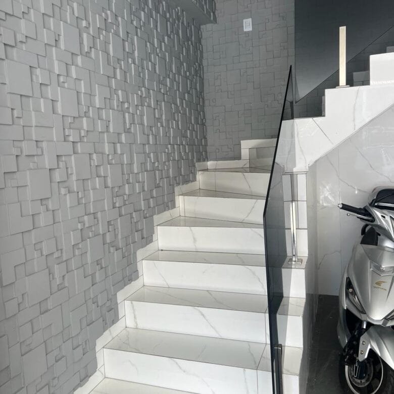 >Parede 3D em salão de festas e academia;